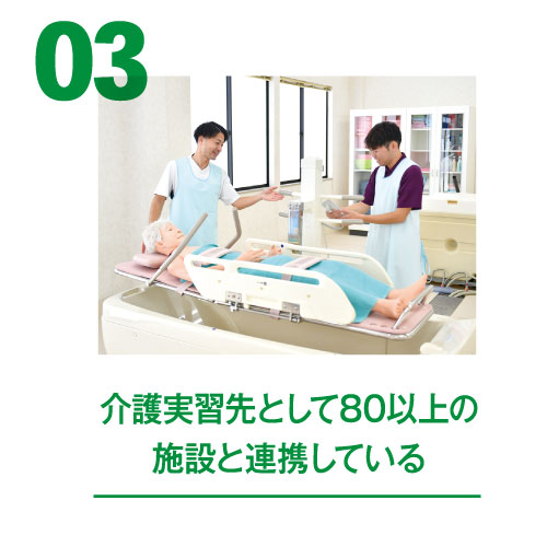 1年次に一通り介護技術を学び、2年次には障害のある利用者への介護のほか、医療部分に係る医療的ケアの授業を受け、更なる知識・技術を修得します。