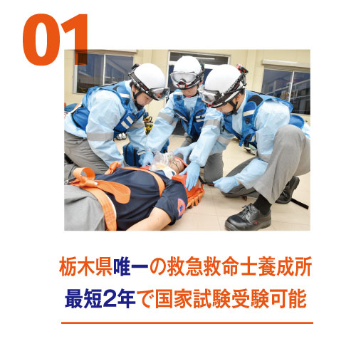 救急医学概論現場における救急処置の方法や、病院に搬送するまでの薬剤の投与・気管挿管の理論と実技救急症候と病態生理学主に呼吸器系、循環器系、脳神経系に関する病態生理と、救急対応時の病状など疾病救急医学救急現場で起こりうる全ての病状の理解外傷救急医学負傷者への処置を迅速に行うため、あらゆる外傷について対応できる知識環境障害学・急性中毒学熱中症や溺水などの特殊な環境での疾病から、薬品や毒物による中毒まで、それぞれに対応する知識シミュレーション実習・臨地実習様々な事故や状況を想定しながら、救護処置の技術を身につけます。 2年次には、病院や消防署といった実際の現場で実習を行います。